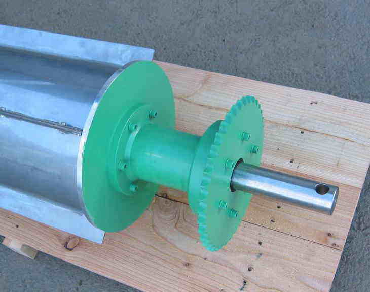 写真のカバー付きの永磁ドラムは318φ-1900L(MG有効1800) 質量約400kg ←左載の大型永磁ドラムの写真は実際に設置をする場合のシャフト固定ブロックの形状を表しています。水平フレームにネジで固定します。ブロック下側の部分をフレームに取り付けて永磁ドラム本体をブロックに設置します。その後にシャフトに穴があいていますので丸棒などで内部の磁石が横方向になるまで約90°回します。実際に上から材料を落として磁選状態が良好な位置でブロック上部のネジで締め付けて下さい。後は付属のスプロケットにチエンを掛けて所定の回転数とギヤードモーターで材料の流れ方向に回転させて下さい。 固定軸 駆動軸