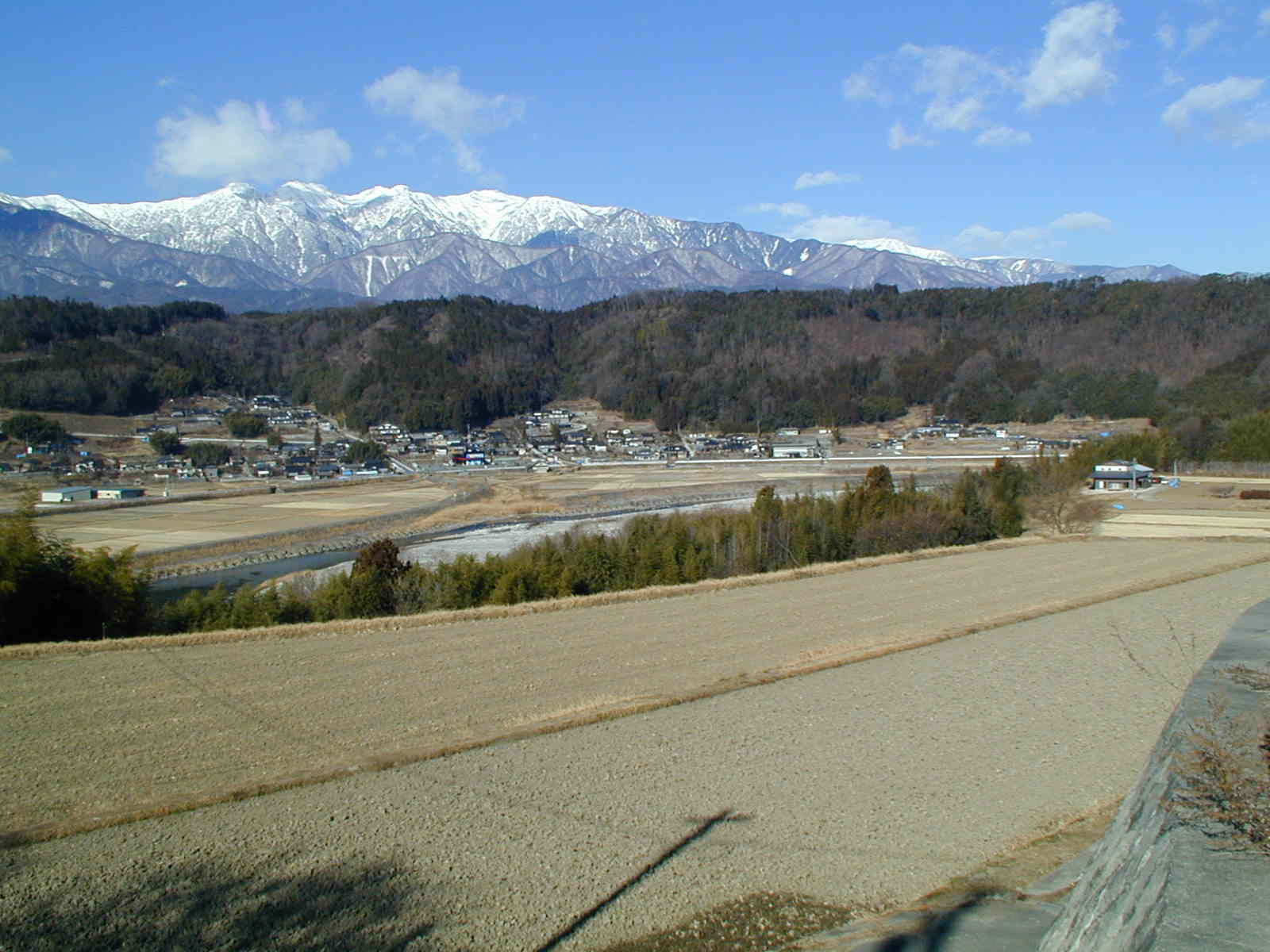 天竜川の東岸から川越しに中央アルプスを望む。 小和田集落を国道153号が通る。