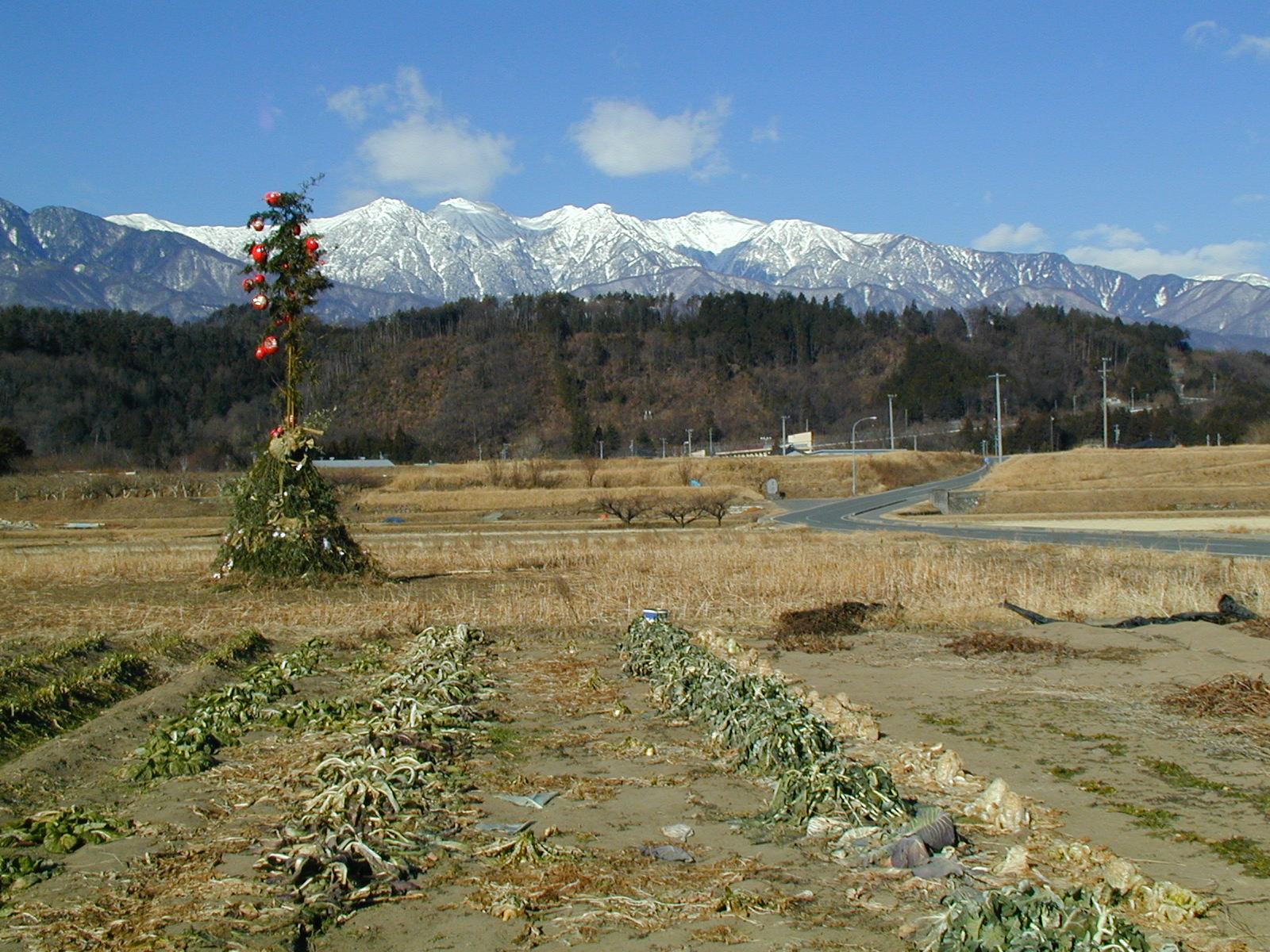 牧ヶ原から望む中央アルプス。 左手に写っているのは火をつける前の「ほんやり」(どんと焼き)。この後夕方から燃やされる。 中央やや右よりに小さく写っているのは、中川西小学校。